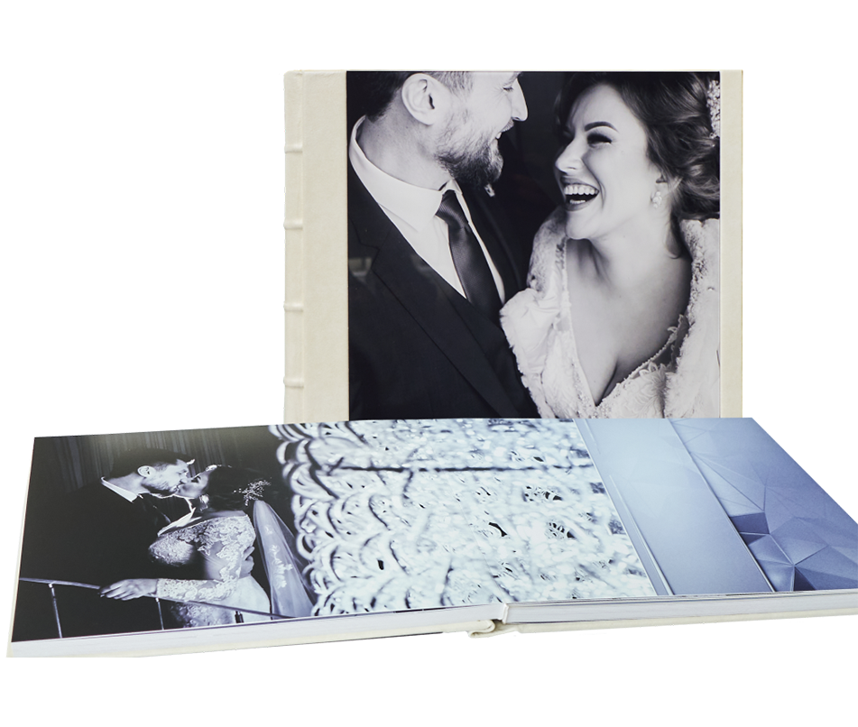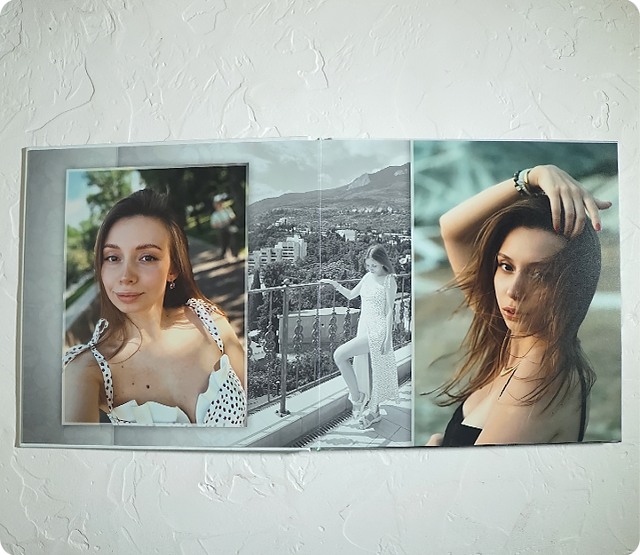 Химическая фотопечать. Плотные листы с основой (толщина 0,6-1 мм). Разворот сплошной, без разрыва или ухода страниц в корешок посередине.